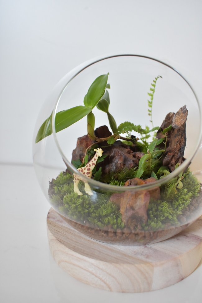 niwanosoのガラス花器にパンタナルさんの植物を配置してガラスの中に小さな世界を作ります。