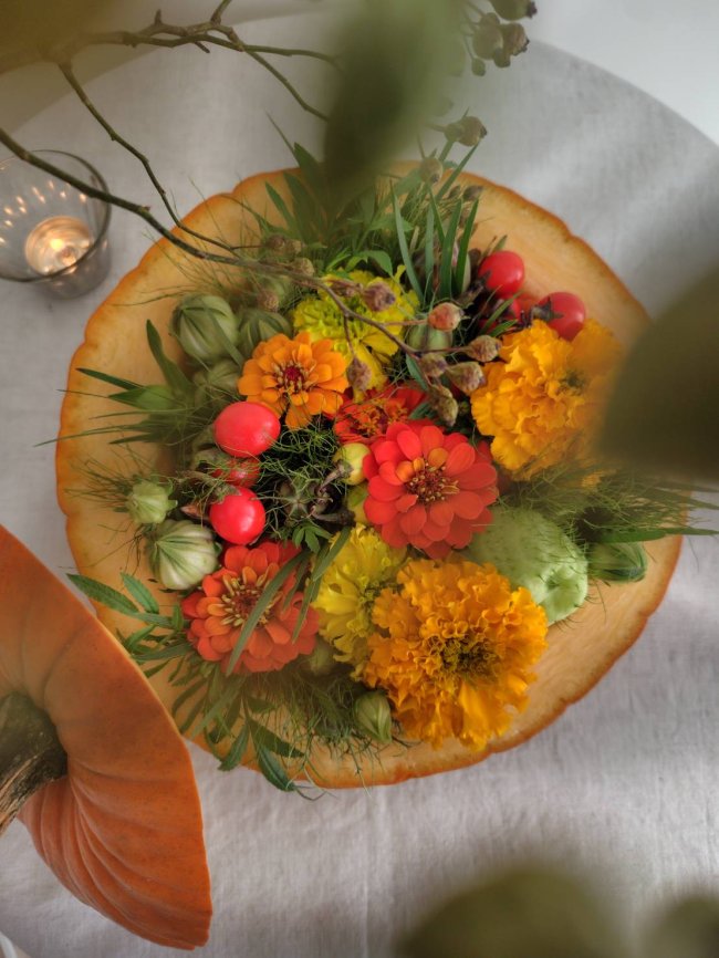 10月はハロウィンらしくかぼちゃと生花でアレンジメントを作ります