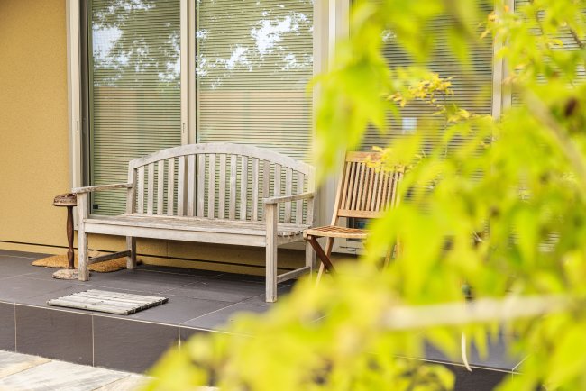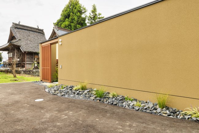 和モダンのアプローチと洋風なタイルテラスが共存するお庭
