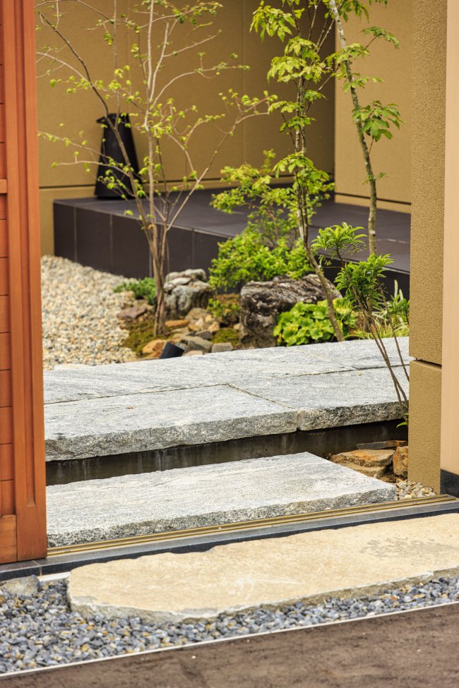 門扉をくぐると石貼のステップとモミジがお出迎え