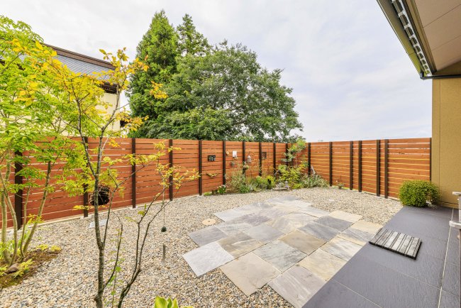 石貼ステップ、タイルテラス、植栽、砂利敷