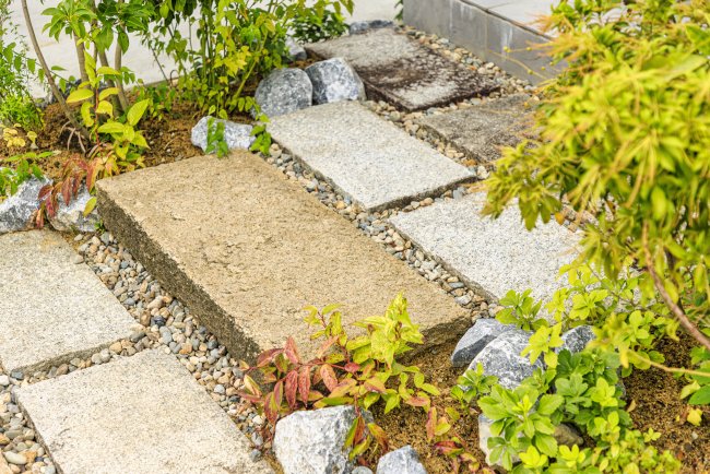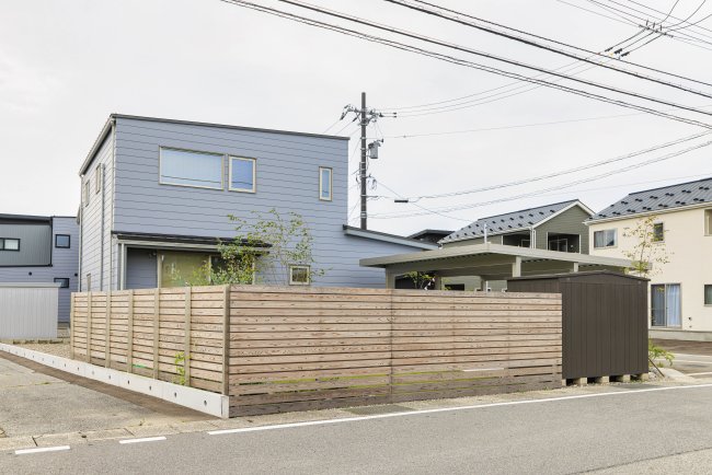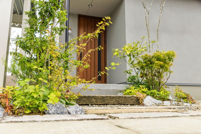 無機質な外壁をウッドフェンスと植栽が馴染ませます