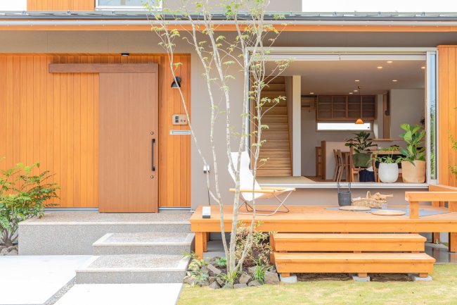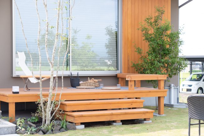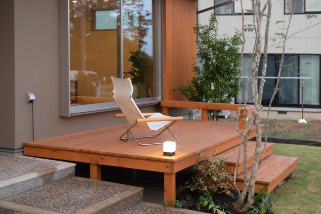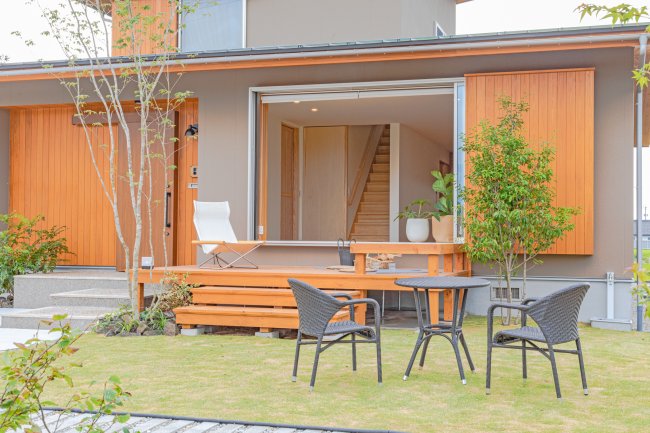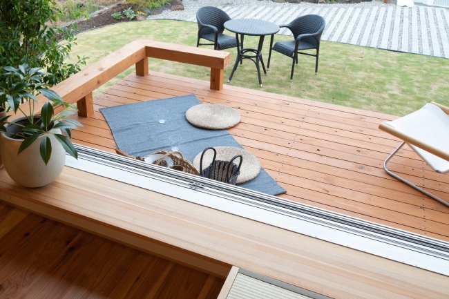 大開口の窓を開けると、リビングのように寛げるデッキと芝庭が広がっています