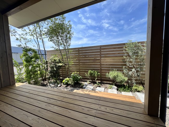 室内からシームレスに繋がるウッドデッキスペース、U字溝で作ったベンチに腰を掛けられるテラススペースなど、植栽に囲まれながらゆっくり過ごせるお庭です。