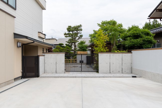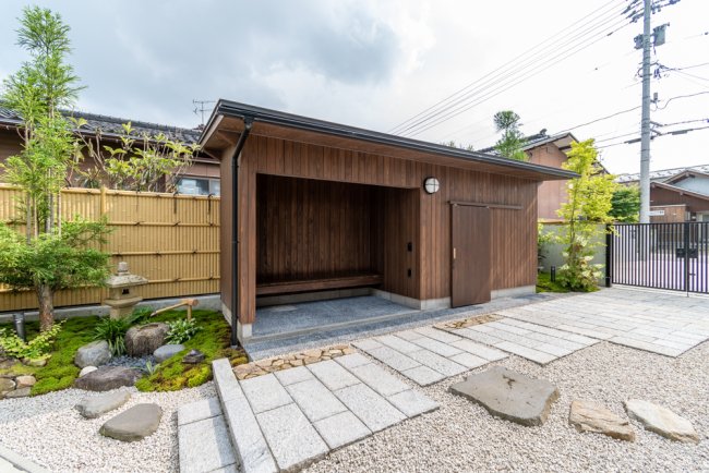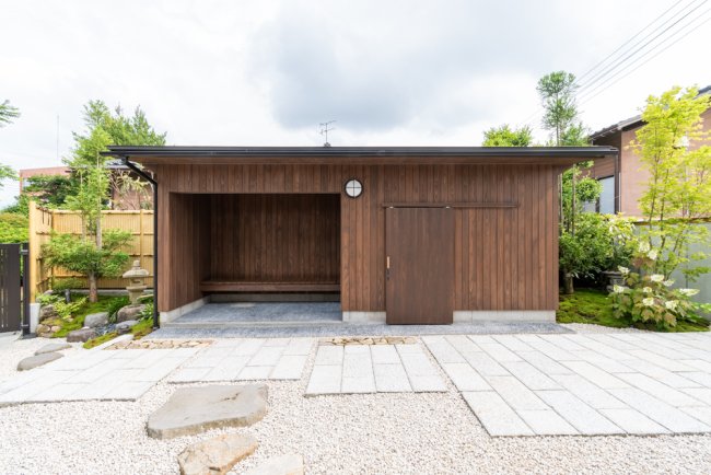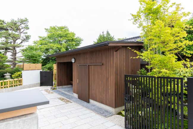 門扉を抜けた先に、休憩スペース兼物置の小屋がお庭を引き締めます