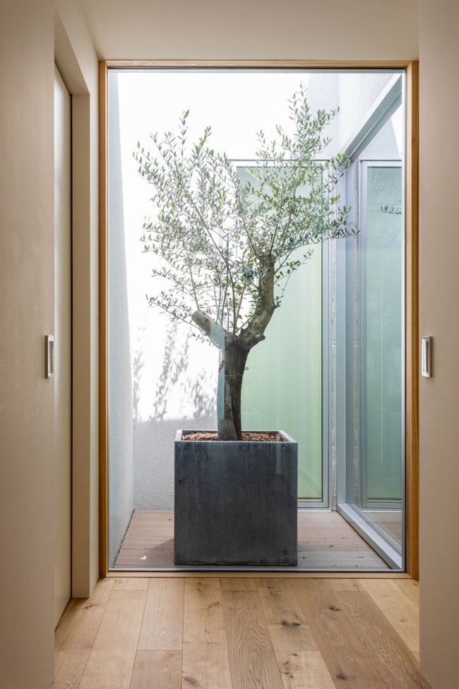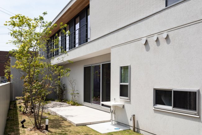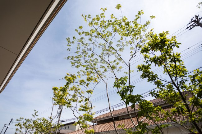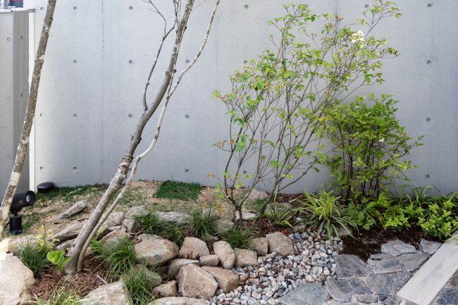 無機質なコンクリート擁壁を背景に緑が引き立ちます